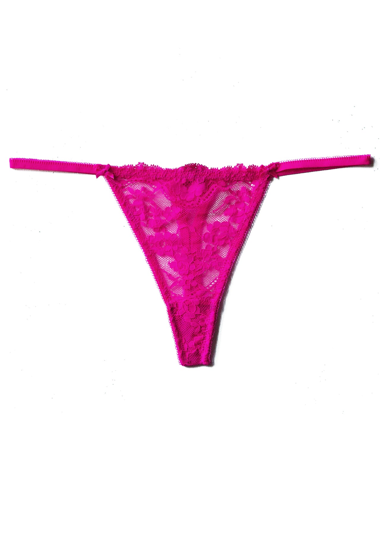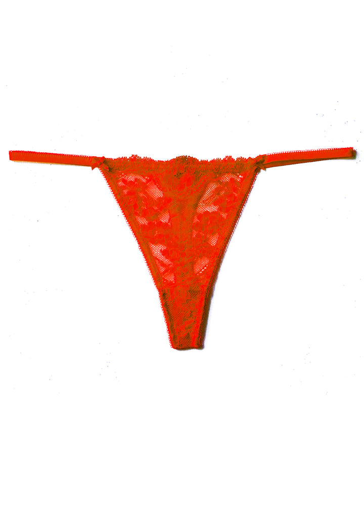 The G-string in Poppy Flowers lace is made in floral French lace with scalloped-edge details and fits low on the hips. The lace is 100% nylon. Hand wash and hang to dry. Made in New York USA. Wear the g-string with the matching demi-bra, full bra, or triangle bra.