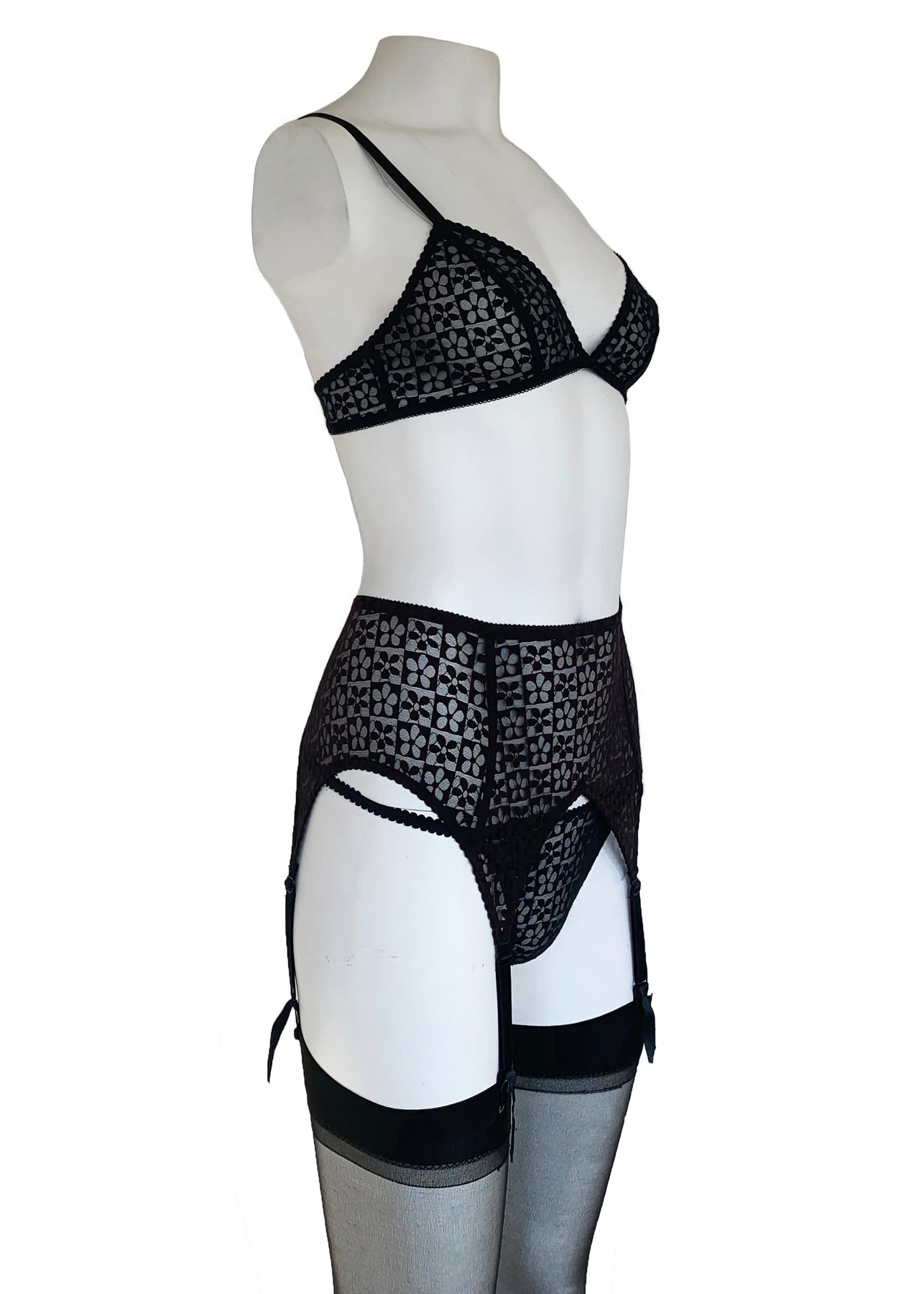 Daisy Jacquard is made in nylon elastane with a geometric pattern of alternating sheer and solid daisies woven into the fabric. The Garter-Belt features a wide front and sides for extra coverage and fastens with an adjustable hook and eye back closure.