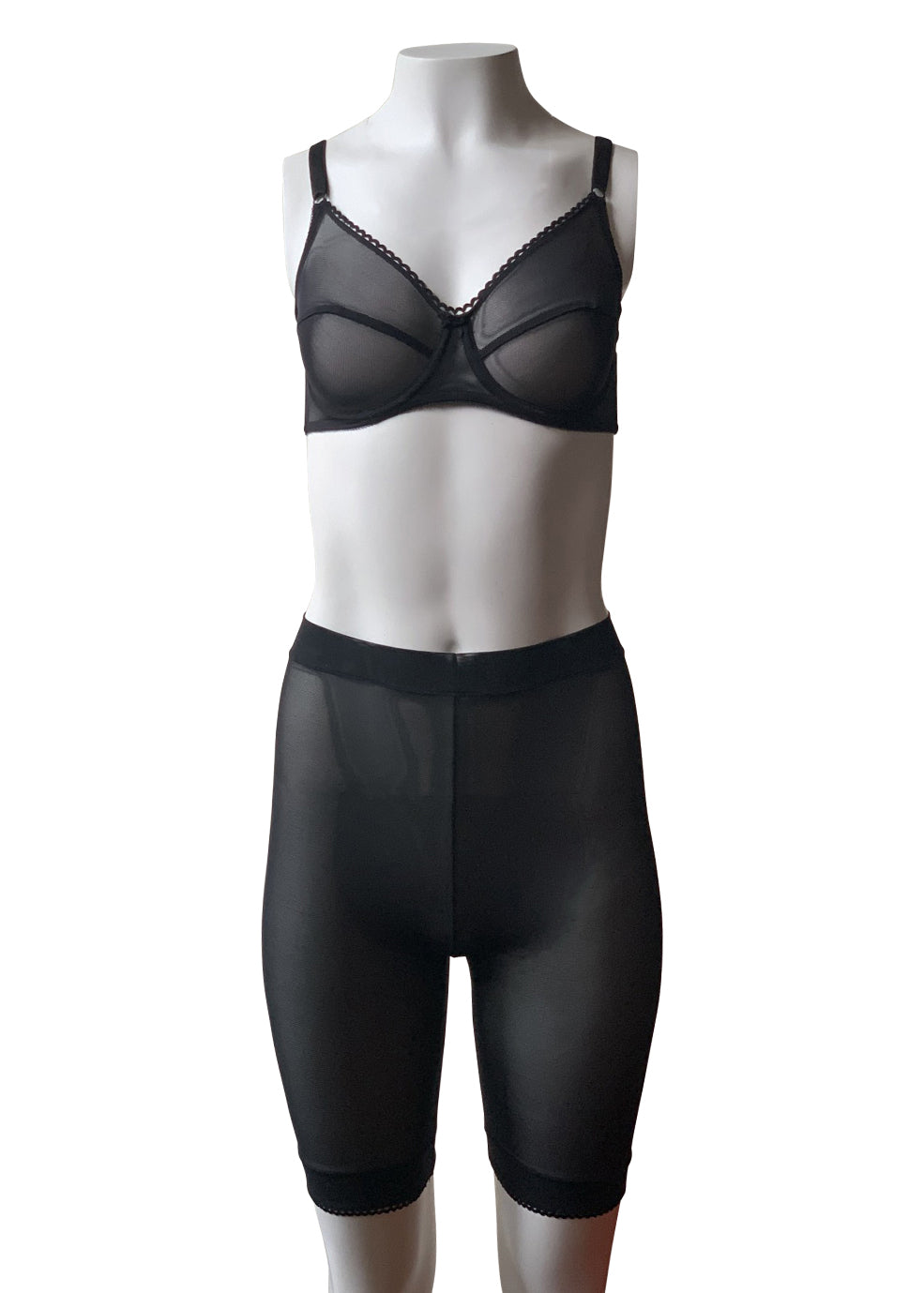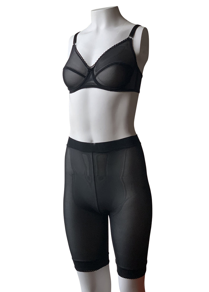 The Sheer French Tulle Bike Length Briefs are a sleek contouring style ideal to wear under clothing that requires smooth lines—featuring a non-roll-down waistband and legs that finish with a wide hem that never cuts into the skin.