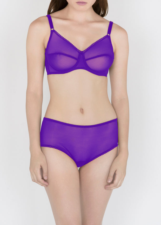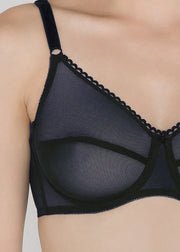 This bra shape is inspired by the classic glamour of the 1950s and provides a natural silhouette with essential contouring for full bust sizes. The décolleté is finished with a feminine scalloped-edge, an inner side panel lines the cups, and boning is built into the side seams for smooth support. Pair it with the Sheer French Tulle g-string, full brief or high-waist brief for the complete set.