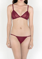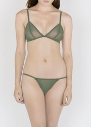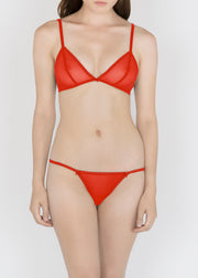 The Sheer French Tulle Triangle bra features a scalloped-edge décolleté, adjustable straps, a narrow back band, and finishes with an adjustable hook and eye closure. Suitable for day or evening wear, this classic shape is supportive enough for light exercise such as Yoga. Pair it with the Classic Full Brief or Thong to complete the set.