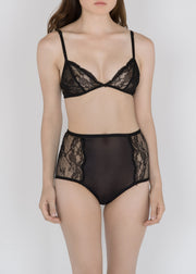 The Surie Anna High-Waist Brief is made in Italian lace tailored with stretch power mesh. The brief fits at the waistline with full coverage rear. Scalloped-edge panels are intricately sewn in vertical waves across the hips. Pair it with the matching Surie Anna Triangle Bra to complete the look.